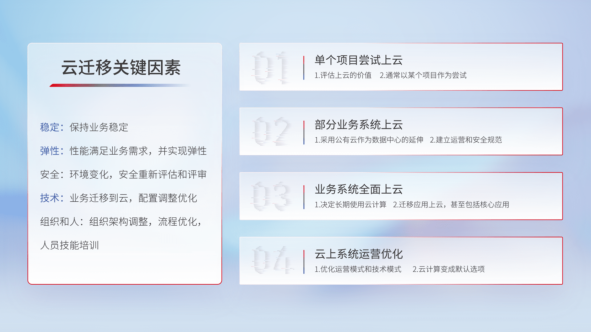 结合实际业务,,从规划设计、、云平台选型、、云原生改造、、、数据迁移、、、、集成交付,,,,迁移全过程为客户识别最佳上云路径,,做好风险识别管理,,,,设计网络架构、、、、身份权限、、、、安全审计合规、、、、操作审计、、、日志审计、、监控告警策略、、多站点容灾设计等,,对云上基础设施进行整体规划,,提升IT治理水平,,以满足弹性、、、高可用、、、高性能的需求。。。。
