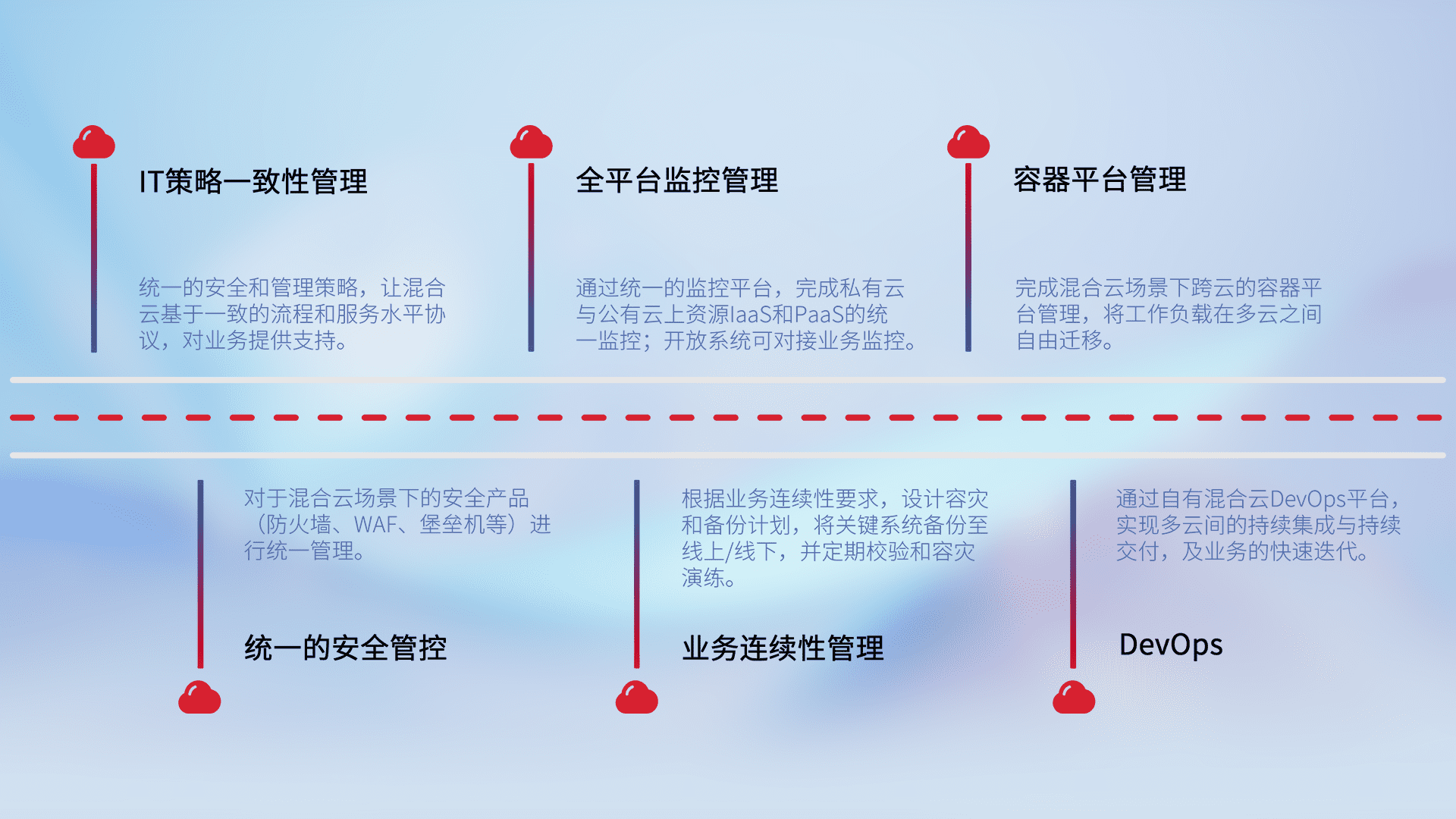 通过多云纳管,,以统一的资源数据模型把客户的云资源进行抽象和封装,,,进而实现对多云资源的统一操作,,保障云资源管理的可靠性、、、稳定性与可用性。。量身定制化运维内容,,配置、、开发运维、、、、补丁管理、、、备份、、、监控、、认证和访问管理、、、审计和日常巡检等,,,,保障在用云过程中的可靠度,,,,稳定度以及高可用率。。