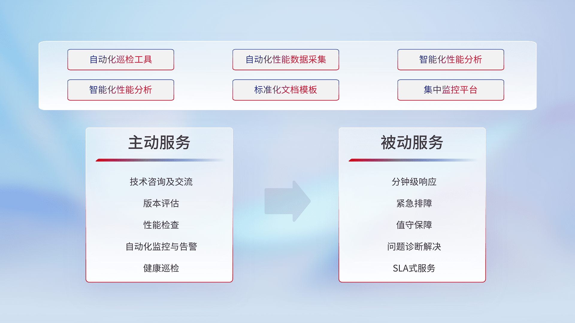 智能化工具和标准化文档,,,,保障服务质量,,,,提供主动服务(包含技术咨询、、、、版本评估、、性能检查、、、自动化监控与告警、、健康巡检)和被动服务包含(分钟级响应、、、紧急排障、、、、值守保障、、、问题诊断解决、、SLA服务)。。。