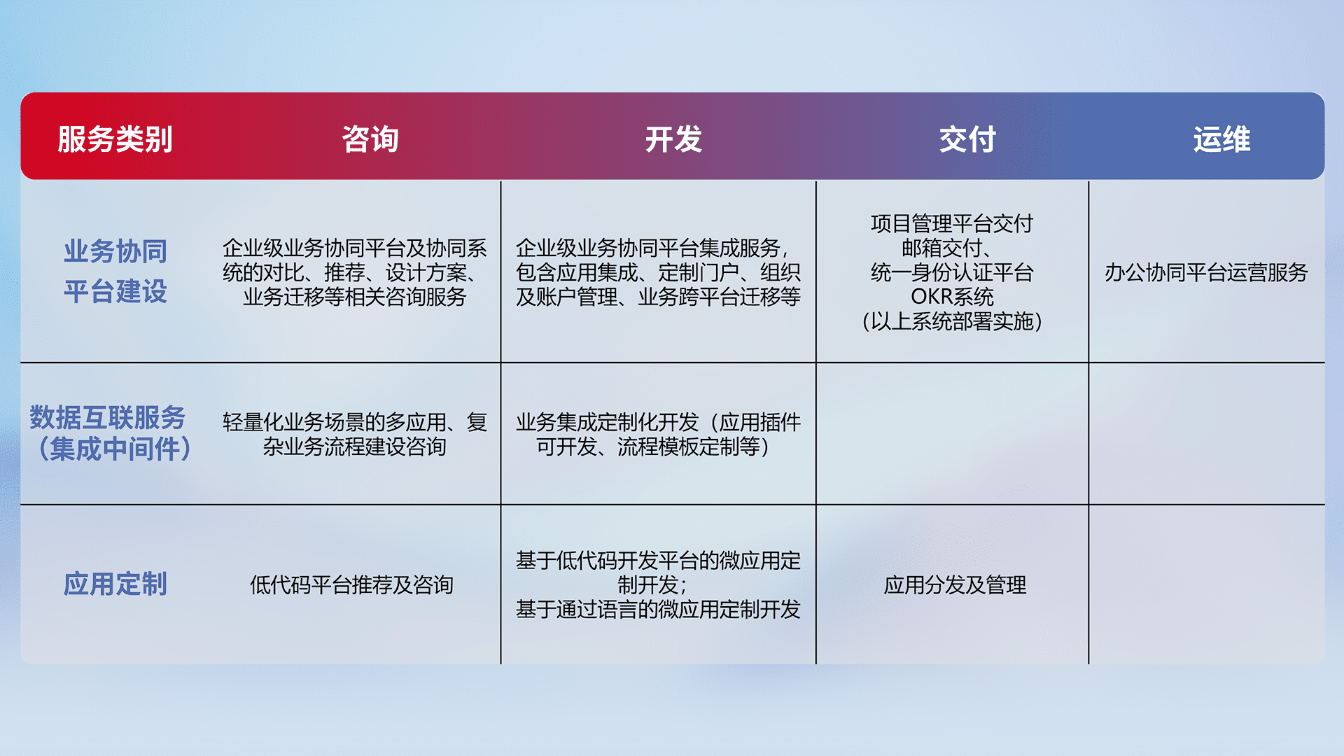 针对钉钉、、企微、、、IDaas等平台级产品提供产品的规划、、方案、、、交付、、、、定制化开发等服务,,,实现如统一协同办公、、智能客户服务、、、混合会议管理、、智能数据查询、、等业务场景,,,,实现数字化转型。。。